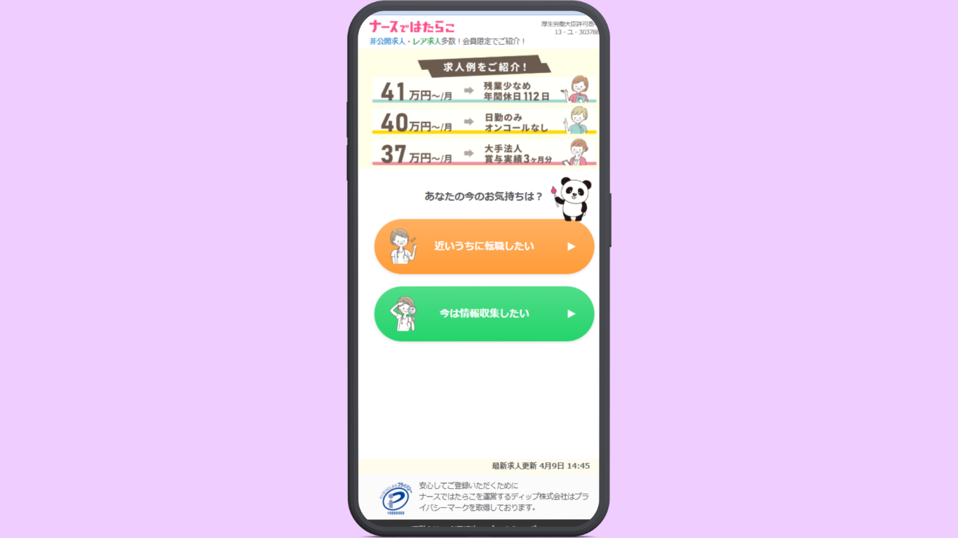 サイトの使い勝手がよく、パンダのキャラクターがかわいい画面です。気になる求人を見つけてそのまま応募できるので、スキマ時間に転職活動を進めたいママ看護師にナースではたらこは向いています。