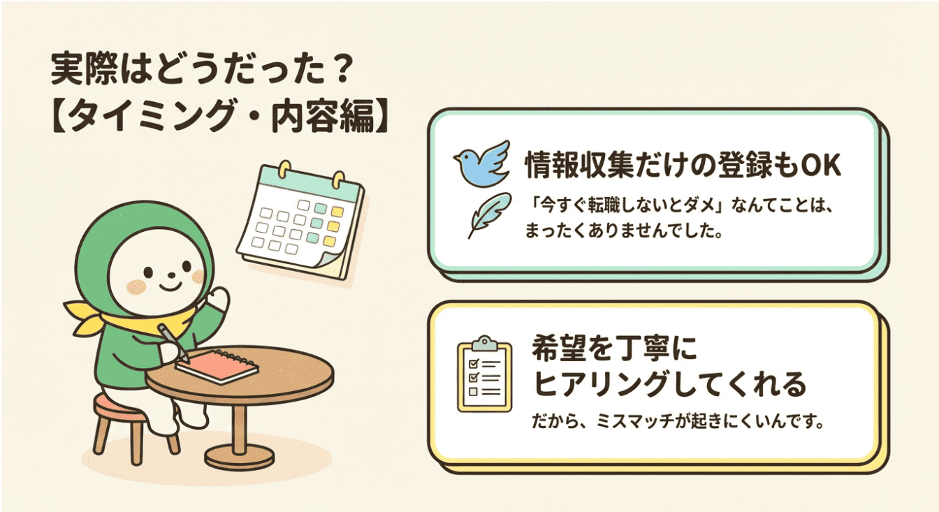 • 📝 希望を丁寧にヒアリングしてくれるので、ミスマッチが起きにくい